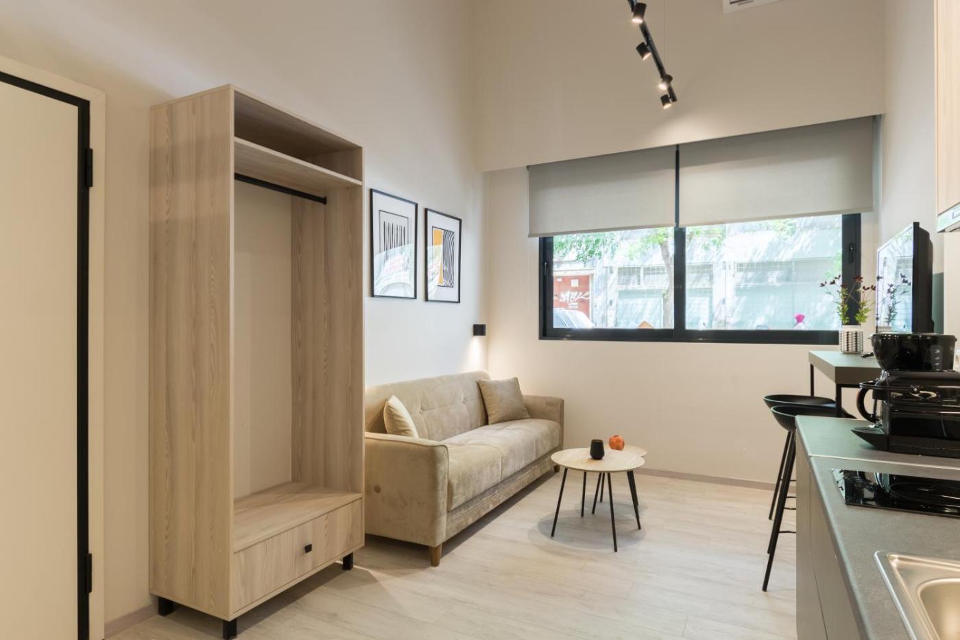 One-Bedroom Apartment. This air-conditioned apartment consists of 1 living room, 1 separate bedroom and 1 bathroom with a shower. The fully equipped kitchen features a stovetop, a refrigerator, kitchenware and a microwave. The apartment provides a tea and coffee maker, a wardrobe, a sofa, as well as a flat-screen TV. The unit offers 2 beds.